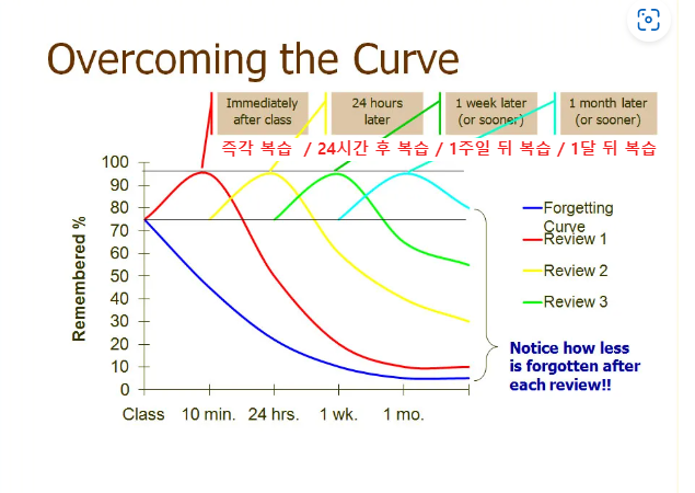망각의 극복 그래프에서 보시다시피 우리가 복습을 반복적으로 할 때마다 망각의 속도는 느려지고, 장기기억으로 많이 저장됩니다. 이를 단어 학습에 적용하면 다음과 같습니다.